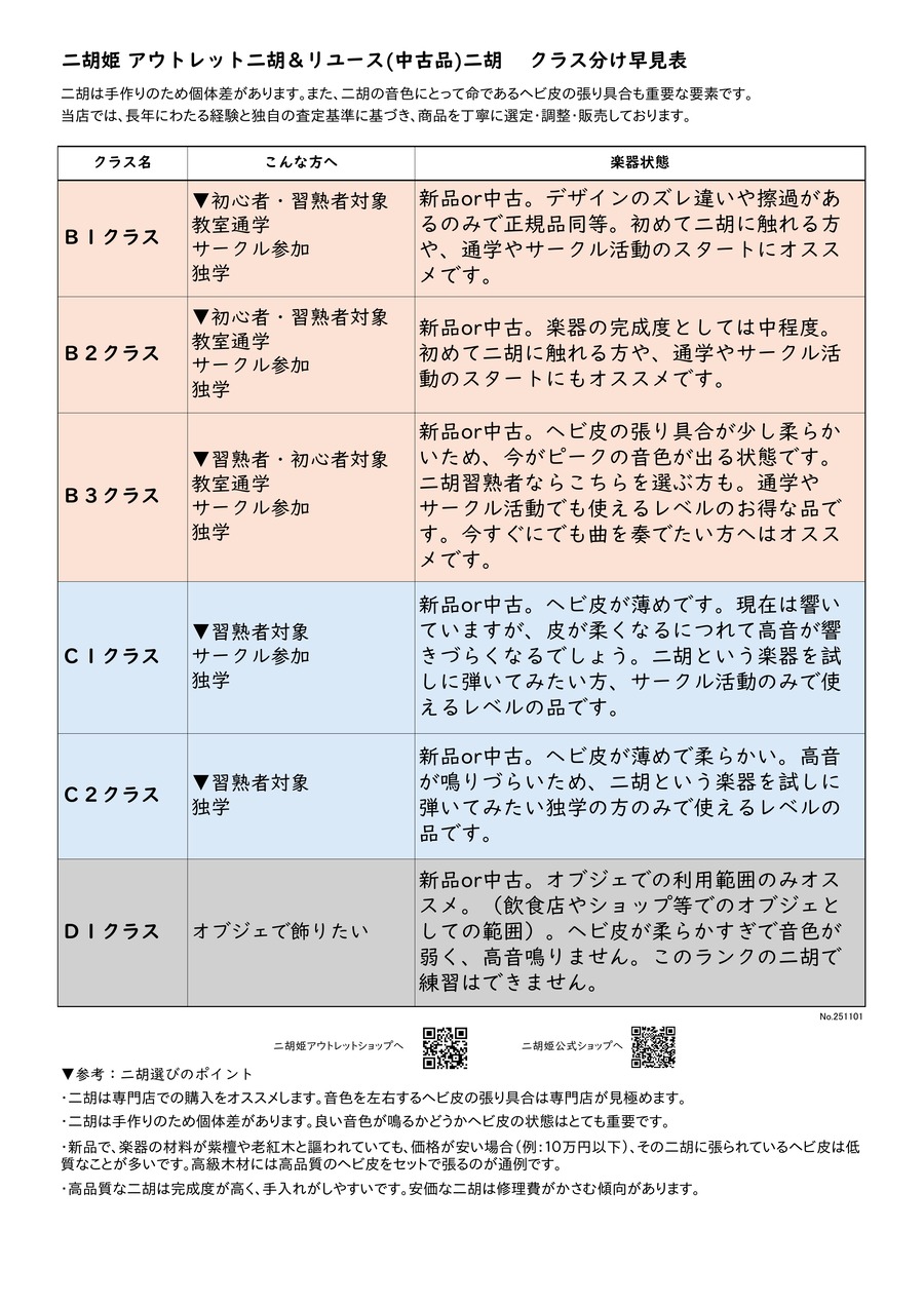 下記に、当店二胡のランク(クラス)についての説明を記載しております。内容をご確認のうえ、ご理解いただけた方のみ、ご購入をお願い申し上げます。